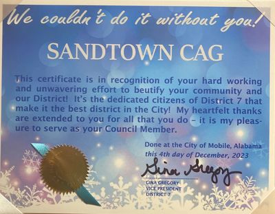 This certificate from the City of Mobile was presented by Mobile City Council Vice President and District 7 Representative, Gina Gregory. Alonzo Yelling, President of Sand Town Community Action Group, received this certificate on behalf of the community. Congratulations Sand Town!